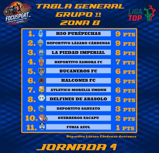 En la segunda posición se ubica, el recién incorporado equipo del Club Deportivo Lázaro Cárdenas –equipo filial del Deportivo Zitácuaro de la Liga Premier- que de igual forma suman 9 puntos, luego de tres triunfos consecutivos y no conocen la derrota. Pero, la diferencia entre H20 Purépechas y Lázaro Cárdenas es de un solo gol en contra más de los portuarios al sumar 6 goles a favor por 2 en contra. En esta jornada 4, el Club Deportivo Lázaro Cárdenas registró su descanso.